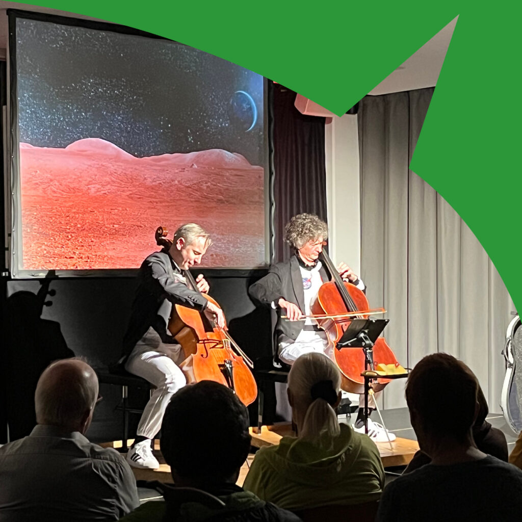 DuoCalva mit ihrem humorvollen und musikalischen Programm «Die Cellonauten» bei uns zu Gast im Mehrzwecksaal, 2025